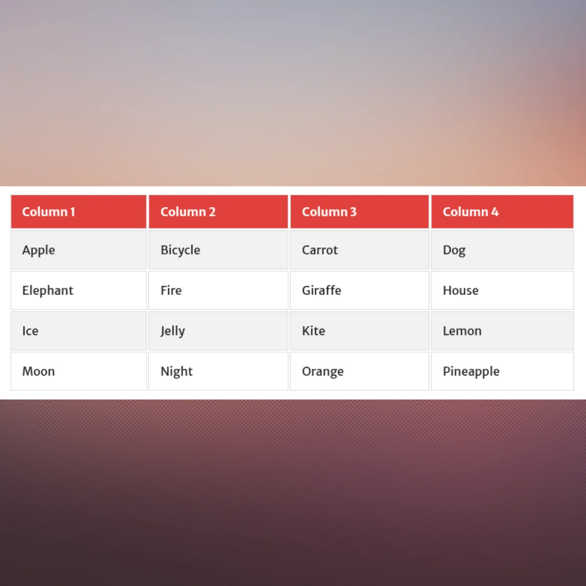 | Apple | Bicycle | Carrot | Dog |